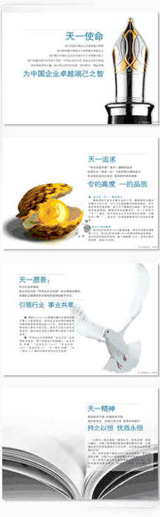 天一使命:為企業卓越竭己之智 天一追求:專的高度  一的品質 天一愿景:引領行業 事業共享 天一精神:持之以恒 優質永恒